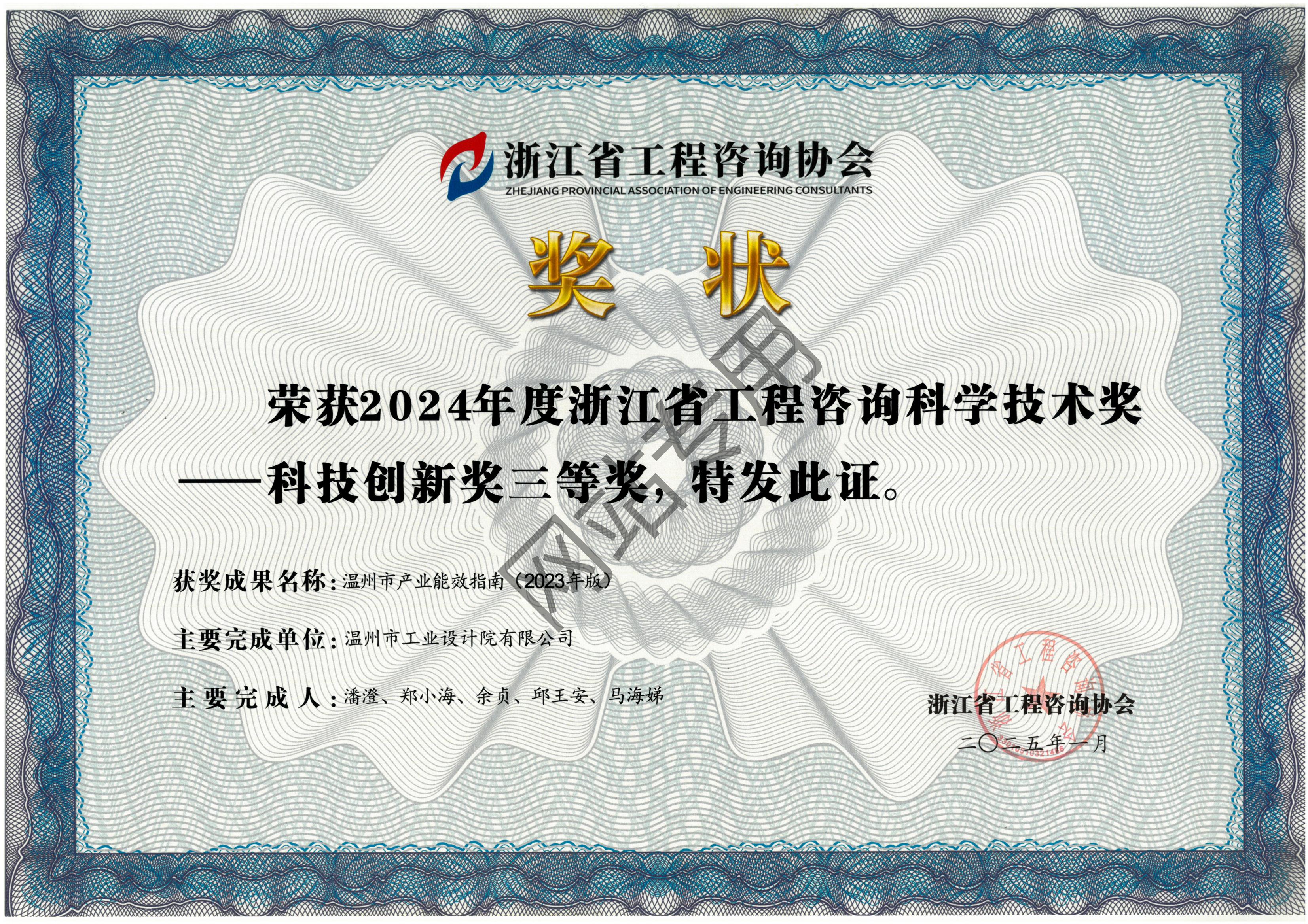 溫州市產(chǎn)業(yè)能效指南(2023年版)項目 2024年度省工程咨詢科學(xué)技術(shù)獎—科技創(chuàng)新獎獲獎三等獎